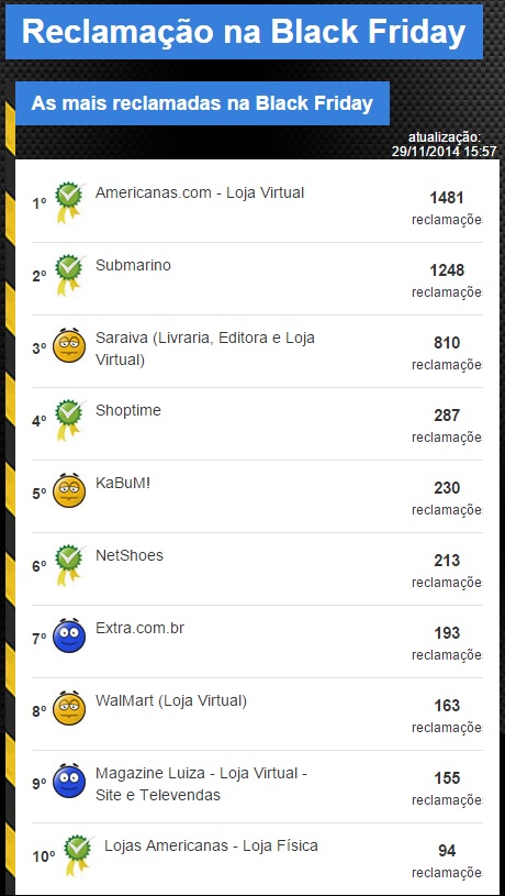O site Reclame Aqui resolveu criar uma página dedicada onde lista as 10 lojas campeãs de reclamações durante a Black Friday. As Americanas conquistaram a medalha de ouro com 1481 relatos. Logo em seguida vem o Submarino com 1248 ocorrências, seguido pela Saraiva com 810. O Shoptime, que faz parte do mesmo grupo dos dois primeiros colocados, veio na quarta posição.