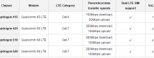 Nas imagens acima, é possível ver um rápido comparativo geral entre os principais recursos dos chipsets e também sobre as conectividades que eles trazem consigo. Como visto, todos os modelos possuem conectividade 4G/LTE, dando suporte ainda para dual-SIM usando a mesma tecnologia.