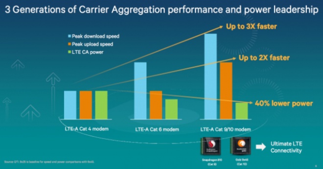 Quanto à conectividade, o Snapdragon 810 suporta o padrão Cat 9 LTE, e é compatível com todos os principais padrões e tecnologias de celulares suportados pelo 4G LTE, incluindo GSM/EDGE, CDMA1x/EVDO, TD-SCDMA e WCDMA/HSPA+. Ele funciona até mesmo na China, onde se vai encontrar todos os sete padrões celulares de hoje. As taxas de downlink são de até 450 Mbps.