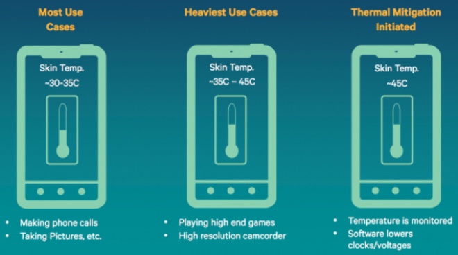 A Qualcomm forneceu uma estimativa das temperaturas do SoC em cenários de uso cotidianos. Sob uso de luz - fazendo chamadas telefônicas, fotografando, navegando em sites típicos - a temperatura do sistema permanece em 30 a 35 graus Celsiuis, que não é nada fora do comum. Os níveis de temperatura podem subir até 45 graus Celsiuis durante os jogos mais exigentes. Este é o ponto onde a mitigação térmica diminui a freqüência de clock para baixar a temperatura.