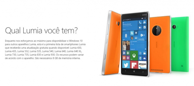 Infelizmente não há uma data concreta para a liberação em nosso país, porém foi dito pela Microsoft que o Windows 10 Mobile começará a ser entregue no início de dezembro, não devendo demorar muito para que o update seja visto por aqui. Além disso, é destacada a necessidade de 8 GB de armazenamento interno, o que justifica a ausência de alguns modelos como o Lumia 530, que precisarão passar por adaptações para receber a atualização.
