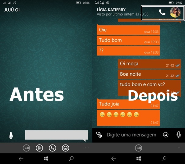 Como pode ser visto, a equipe de desenvolvedores do WhatsApp está testando uma alteração que aproxima o mensageiro do Windows 10 Mobile ao que temos em sua versão para Android, pois o ícone de chamadas foi movido para o canto superior direito junto à uma miniatura da foto do contato correspondente ao chat em aberto. Vale destacar que esta é a primeira vez que a imagem do contato é exibida na página da conversa no Windows Phone, o que demonstra claramente uma das maiores diferenças entre a antiga plataforma e o Windows 10 Mobile.