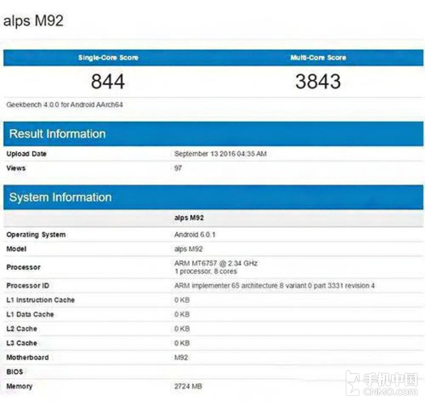 Como visto acima, o Meizu Pro 6s conquistou 844 pontos no teste single-core e 3.843 pontos no teste multi-core. Nas informações sobre o smartphone é visto que o mesmo foi registrado como ‘alps M92’. Logo abaixo vemos a confirmação do Helio P20 (MT6757), além da quantidade de memória RAM – que neste caso são 3 GB.