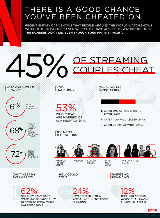 Pode até parecer - literalmente - história, mas uma pesquisa recente divulgada pela própria Netflix revela que cerca de 45% dos casais que assistem as produções do catálogo juntos têm uma maior propensão a cometer traição. Sim, você não leu errado, mas antes de parar de ver séries e filmes com seu amor, tenha em mente que o sentindo de traição proposto pelo estudo é o outro: o ato de ver um episódio antes do seu parceiro (a).
